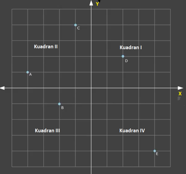 Jawaban: Posisi Titik E adalah 4 satuan di bawah sumbu X dan 4 satuan di sebelah kiri sumbu Y